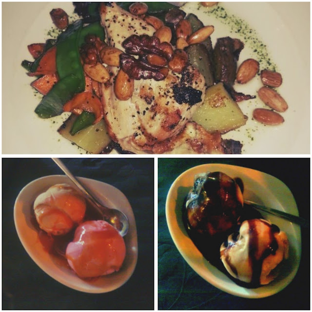 Saatiin lisäksi heidän jälkiruokalistaltaan jäätelöannokset ilmaiseksi Foursquare-sovelluksen kautta. Tämä tarjous on siis (ainakin) Jyväskylän Jaloon ensimmäistä kertaa sisään linkkaaville, muulloin sitä ei taida saada. Annokseen kuului kaksi jäätelöpalloa + kastike. Misterin annos on vasemmalla, eli Baileys-jäätelöä & vadelmajäätelöä kinuskikastikkeella ja mun oikealle – Baileys-jäätelöä & limejäätelöä suklaakastikkeella.