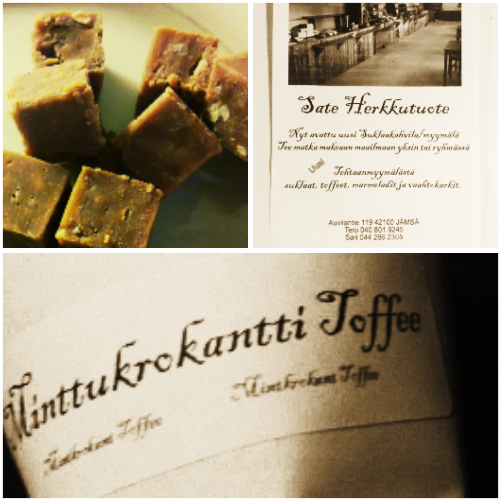 Kuten aikaisemmin kerroin, ostettiin siis Ween Maan Wiljaa -markkinoilta sunnuntaina hiukan namia. Tai siis Misteri osti, mutta kuitenkin. Maisteltiin ensiksi suolapähkinätoffeeta, joka oli muuten aika törkeän hyvää, mutta päädyttiin ostamaan minttukrokanttitoffeeta. Vaikka paketti oli iso, niin sisältöä ei ollut hirveästi. Ja käsityöhän maksaa, joten tälle satsille tuli hintaa viitisen euroa. Tosin kun Satelta ostaa niin tietää saavansa rahalleen vastiketta. Olen ennenkin maistanut heidän suklaitaan, jotka ovat taivaallisia.