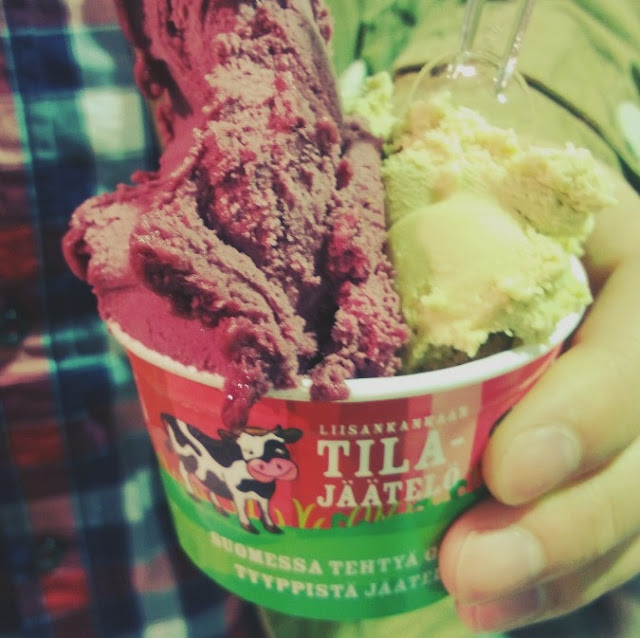 Translation: Last Sunday there was some kind of a market where people were selling very basic Finnish food – salmon, home made ice cream, sweets, meat, clothes and everything else you can imagine. We tried out this home made ice cream, which comes from Pihtipudas. You can google Liisankankaan tilajäätelö and you can at least find their Facebook page. They make the most amazing licorice ice cream I’ve ever tasted – and that’s a lot said 😀 We also bought some garlic sauce, salmon and toffee. I’ll write another post of the toffee alone. It was a fun event, I’d like Jyväskylä to have more of these 🙂