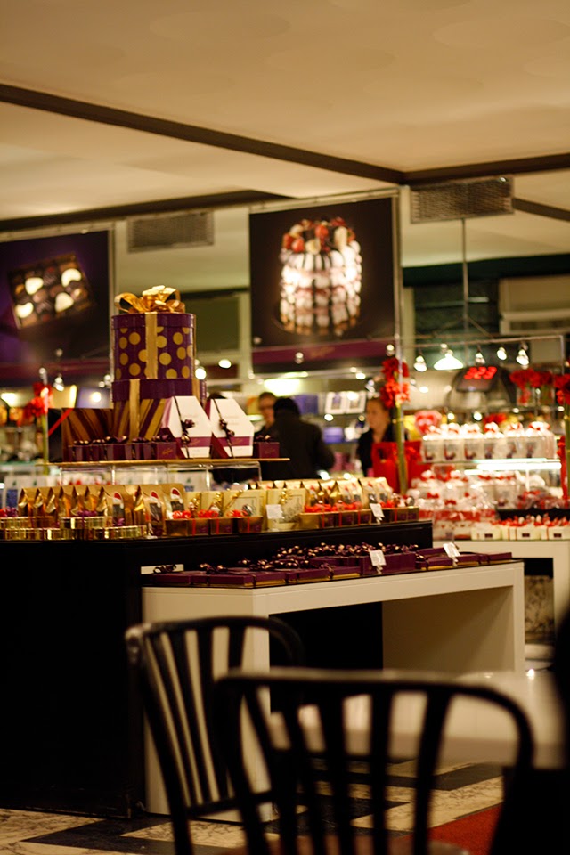 Helsingin reissulla käytiin poikkeamassa myöskin Fazer alkuperäisessä leipomomyymälässä Keskuskadulla. Olen käynyt paikassa muutaman kerran aikaisemminkin, Ronjalle tämä taisi olla ensimmäinen kerta (korjaa jos olen väärässä!). Päädyin vain kuolaamaan kaikkia ihania kakkuja ja suklaapakkauksia ja menin pelkästään kahvilinjalla tällä kertaa. Yleensä mukaan on eksynyt kakkupala joka sai kuitenkin nyt jäädä jonkun muun lautasta koristamaan.