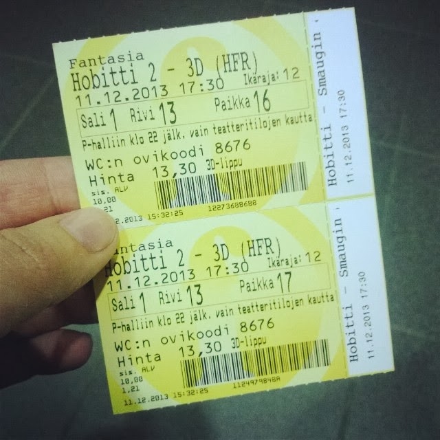 Käytiin tuossa keskiviikkona viettämässä hiukan sisko-veli-aikaa uusimman Hobitin merkeissä (elokuvan koko nimihän on Hobitti – Smaugin autioittama maa). Reissusta sen verran että se oli mun joululahja tuolle pikkuiselle joten biffasin sekä leffan että eväät. Mun limsalle kävi hiukan hassusti – aivan viime minuuteilla neljä henkilöä päätti marssia vielä meidän ohi keskipaikoille joten potkasin siinä sitten limuni kumoon…. Olin kerennyt juoda siitä semmoisen desin verran ja kyllä ketutti. Murh.