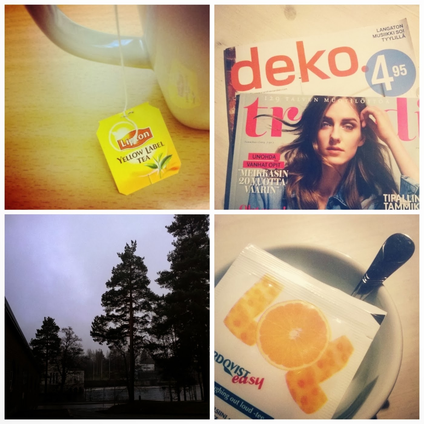 Töissä teetä, kahvia, vettä, karua luontoa ja harmaan taivaan katselemista. Kotona lehtiä, oma sänky, läppäri ja lisää teetä. Tänään on pakko tehdä illasta jotain muuta kuin istua kotona, raahaudun vaikka sinne lentopalloharjoituksiin istumaan kentän laidalle jos en pelaamaan mene. Pakko nähdä muitakin naamoja kuin työkaverit ja perhe. Muuten flippaa tämän lyhyen ihmisen päässä ja pahasti.